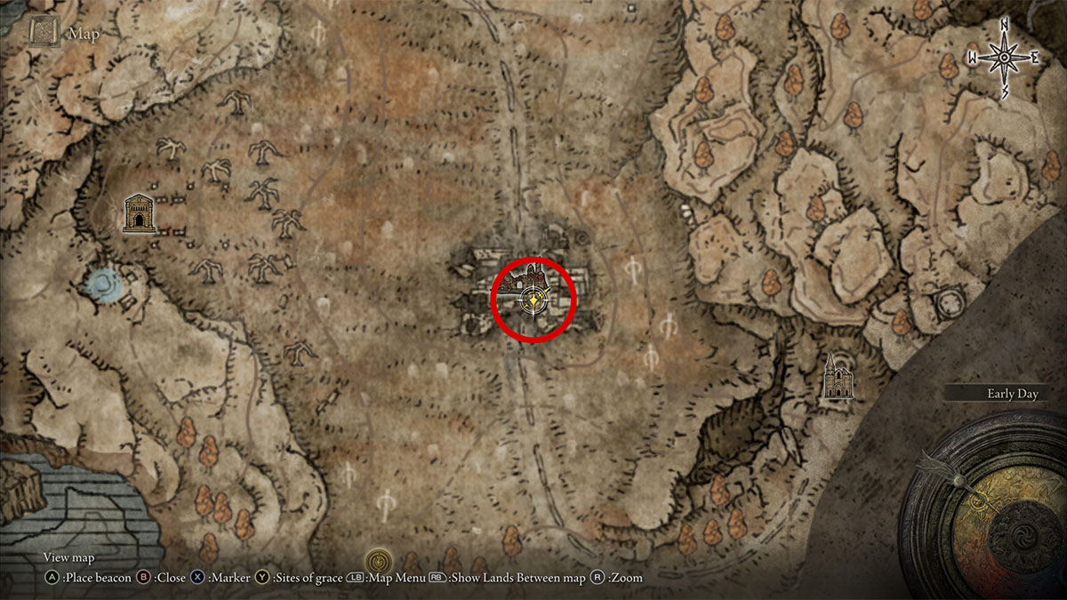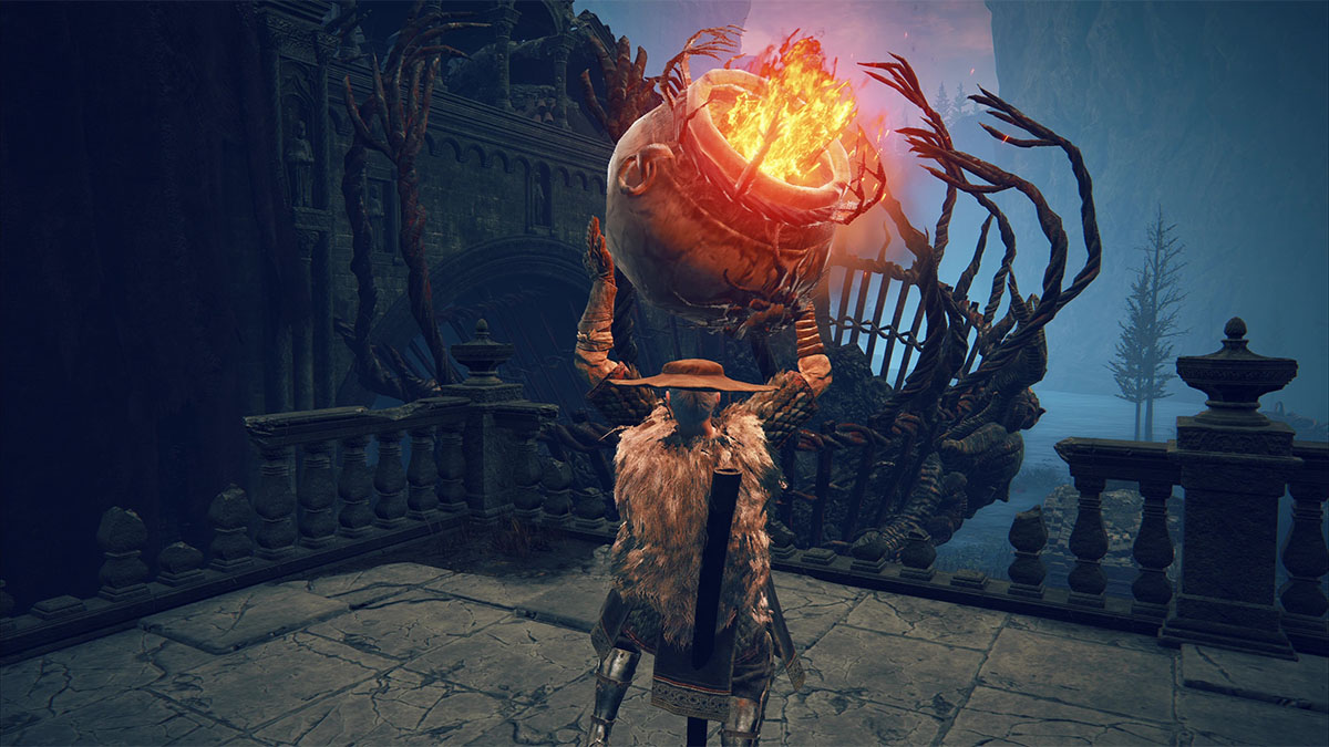 Now, head back to the Ruins of Unte and, from the Castle Watering Hole Site of Grace, keep toward the northern cliffs. You’re looking for the ruined building leading up to a landing overlooking the Furnace Golem, and you need to wake. It’s on the northwest side of the ruins. From there, you have a good vantage point on the Furnace Golem’s…head cage? Stand facing it and throw the pot at the Golem. You don’t need to land it perfectly in the cage. As long as some of the fire hits, you’re good.