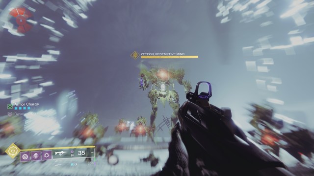 Follow the tunnel until you reach a large Vex Gate. Nothing will happen at first, but when you approach the gate and step on the platform, Vex enemies will spawn in great numbers. Kill everything. Once the dust clears, a final wave will spawn, including a huge Vex Minotaur boss named Zeteon, Redemptive Mind.