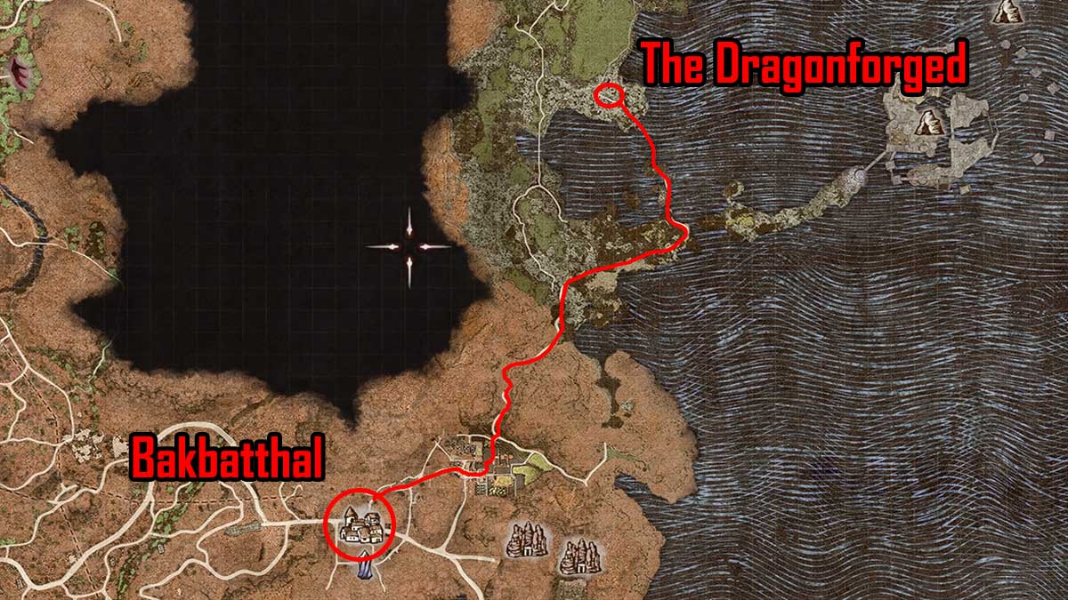 You get Wyrmfire gear through Wyrmfire Smithing, which is unlocked when speaking to the Dragonforged. He’s in a cave on the Batthal Coast. Follow the map above until you reach the coast, and then descend to the beach. I recommend doing this during the day for better vision. Once you’re on the beach, continue following the map until you see a cave.