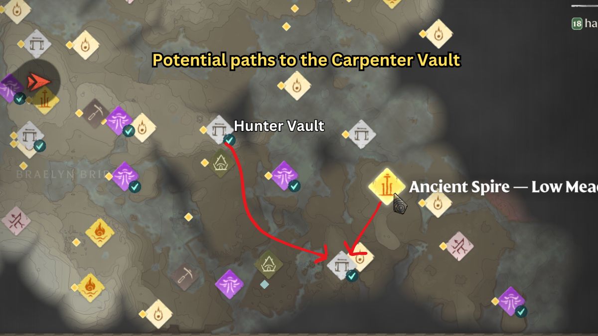 The Carpenter is found in the southeast portion of the Enshrouded map, east of the Longkeep starting area. If you still need to get the survivor, I found the best way to get to the Carpenter Vault is from the Low Meadows Ancient Spire or the Hunter Vault. From there, you can easily make your way towards the entrance. I marked the map below with a simple path for your convenience.