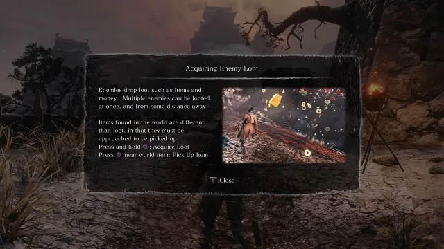 Sekiro‘s tutorial does a pretty good job of showing you the basics, and the many texts in the game tell you how to perform other necessary actions, like picking up loot and money.