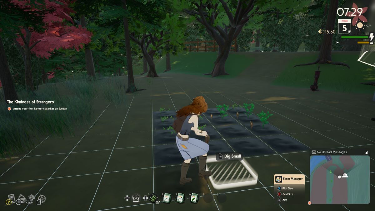Before you can plant your seeds in SunnySide, you’ll need to pocket all three starter tools. You’ll find them inside a cardboard box in your shed. Assign each tool to a slot on your tool wheel, then get started on readying your field. You’ll likely need to clear the grass in the area with your nata first, as your crops won’t grow well if they’re neighbored by weeds. After that, till as many blocks as you need with your digging fork.