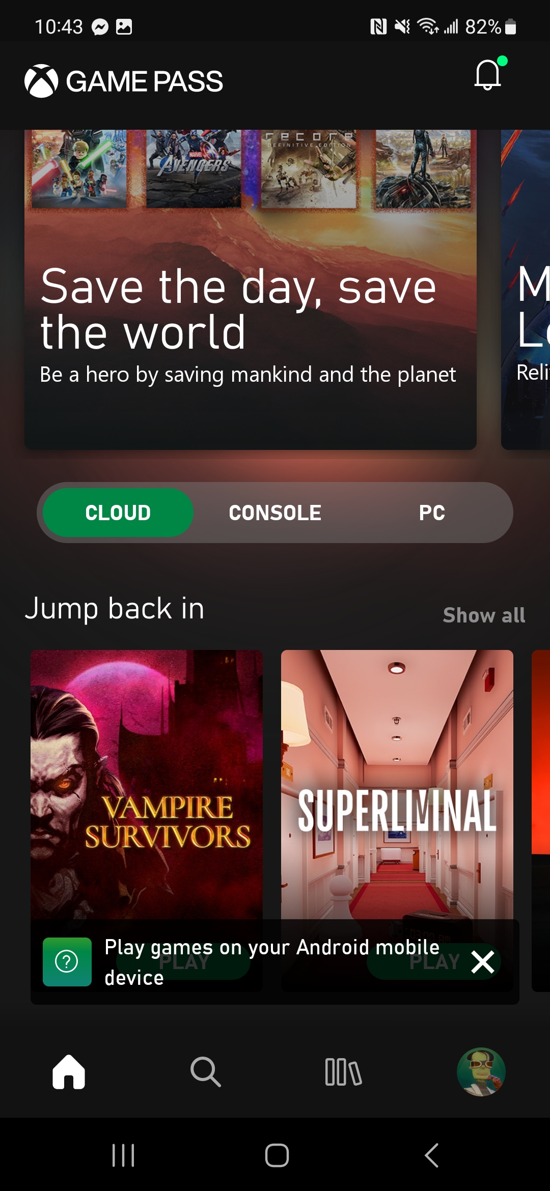 Next, tap the Cloud tab on the Game Pass main menu. It’ll show you a list of the games you can play on your device via the cloud.