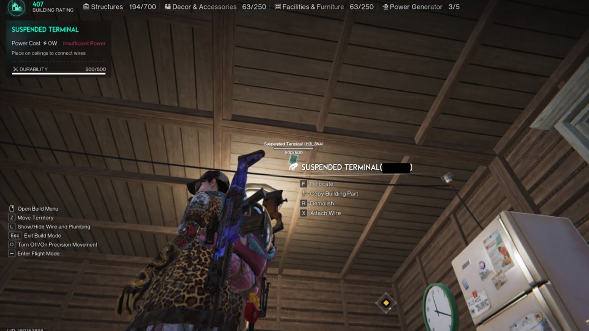 In addition, you cannot relocate the wire as you can with other objects while in build mode. Instead, you’ll need to remove the wire and then use the attach function to create a new wire to another pylon or terminal in a different location than where you have it now. To do so, highlight a pylon with the white dot until you see the menu appear. Then, press the X key to attach a new wire to it. Luckily, doing so doesn’t cost any materials, so you can experiment until you find the best setup for your building.