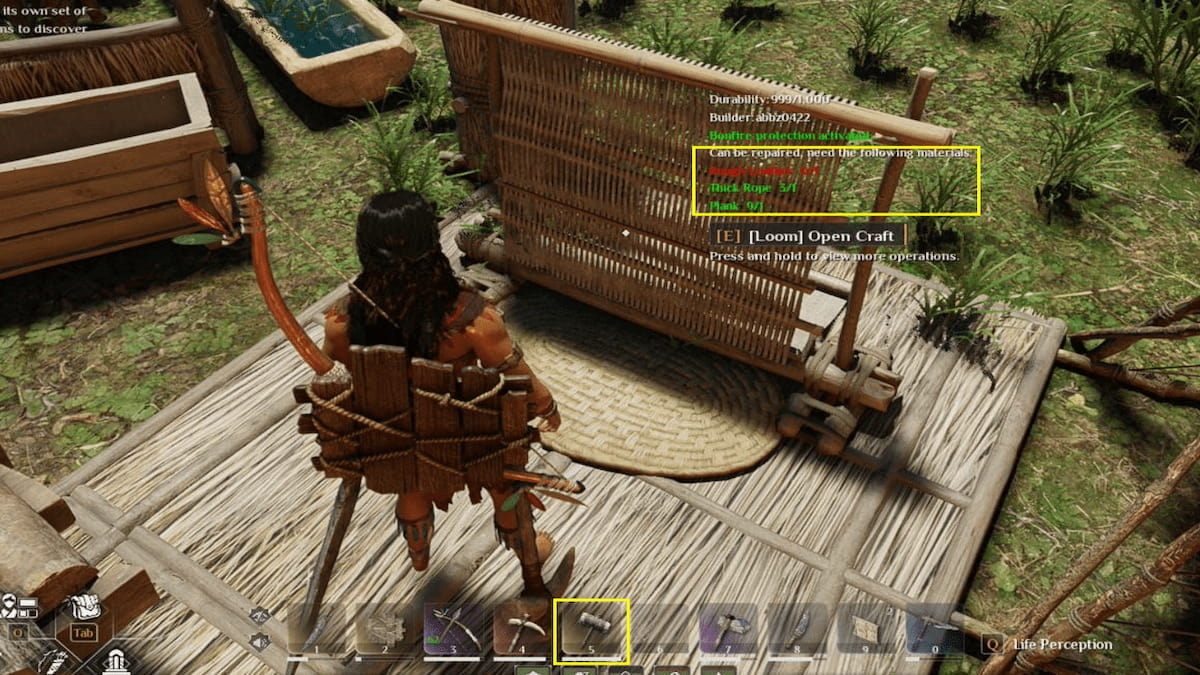 Once you have a hammer, make sure it’s equipped through your inventory or your shortcut slots. Now, you can repair any structures around your camp. To see if a structure needs repair, hover over it so you can see its durability. If the amount is less than full, the structure can be repaired (usually, it will tell you right underneath the durability if repairs are available).