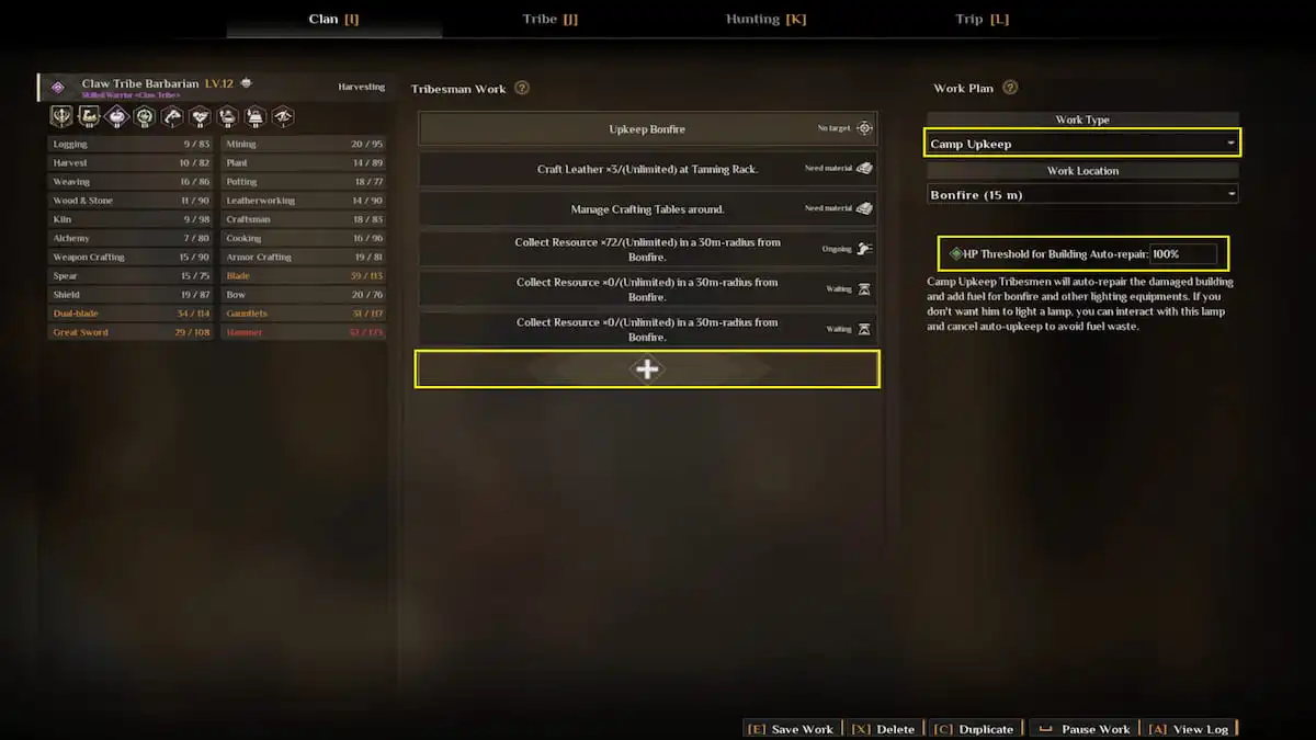 You can adjust the HP% you want the structures to be before the Tribesman repairs them. However, you’ll also need to give them a construction hammer for them to be able to keep up with it. Camp Upkeep will also include keeping your bonfire lit, so it’s very handy to assign to someone.