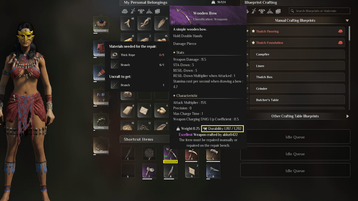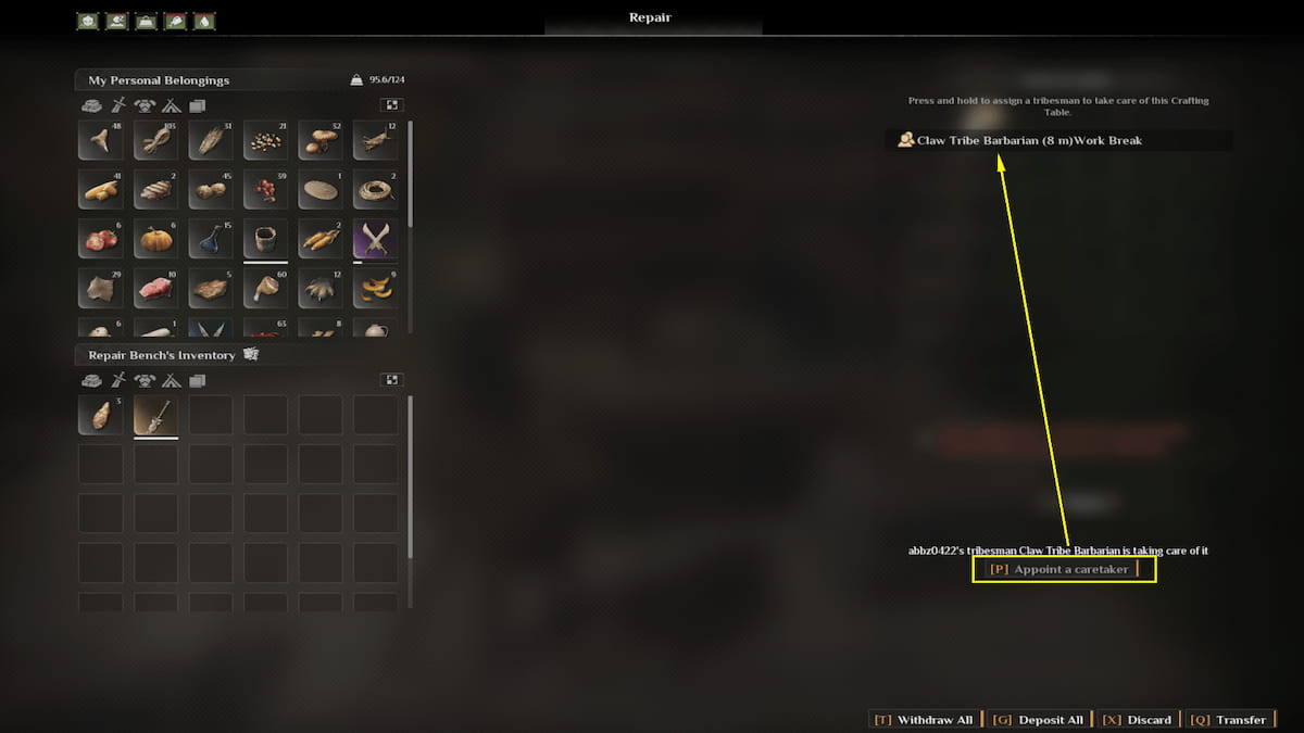 The Repair Table is convenient because you can throw any of your broken gear in there and then have a Tribesman take care of repairing them. All you need to do is drag the items into the “Items to repair” slots and then, rather than press repair, press P to “Appoint a caretaker.”