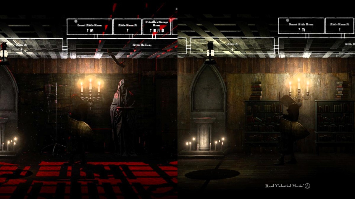 As you can see in the picture above, my environment has changed based on my curse level. You should complete this puzzle on a fresh night when your curse level is low or stand in the room while burning a candle. You’ll see the environment change. Once it does, look for the “Read ‘Celestial Music'” prompt on your screen.