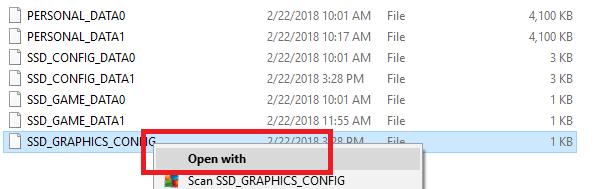 When you get to C:Program Files (x86)Steamuserdata(Your User Profile)543900local and finally see the SSD_GRAPHICS_CONFIG file, right-click that file and choose the option to open with a basic text editor like Notepad (don’t do anything with fancy editing tools like Word, as this will screw everything up).
