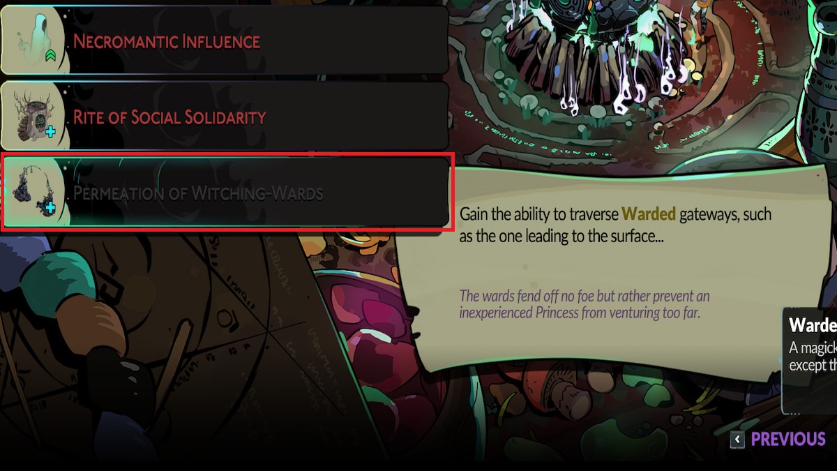 Permeation of Witching-Wards incantation is unlocked by talking to Hermes for the first time and then gaining his Boon where he tells you Melinoe’s help is needed on Olympus. After that, you need to reach the Hecate boss and discuss going to the surface with her. After finishing that run and reaching her again, the Permeation of Witching-Wards Incantation will appear in the Cauldron.