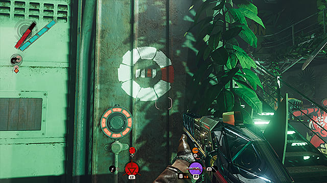 First, I suggest you find the opening pictured below. When you come down the stairs to the room with this puzzle, keep left and follow the wall. You’ll come to a hole, covered in breakable boards. Kick these and hack the nullifier, restoring your powers. This can make the puzzle much easier.