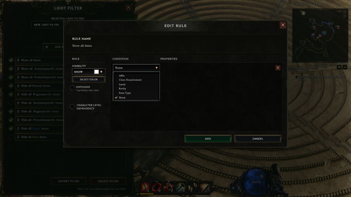 There are five condition choices for Rules: Affix, Class Requirement, Level, Rarity, and Item Type. For each condition, you must select a Show or Hide under the Visibility tab. However, one of my favorite optional features is the ability to recolor items. You’ll see the option to select a color directly under the Visiblity. For instance, if you add a rule to recolor all two-handed weapons to bright green, they’ll now appear as that color when they drop. This is incredibly useful and will streamline your gameplay.