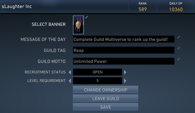 Leaders or Officers of a guild can edit various things. You can decide on a guild banner, message of the day, guild motto, recruitment status, and level requirement to join.