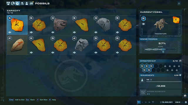 Hover over Fossils to see the dinosaur DNA they contain and its current Genome progress; the number in the top left of each icon indicates the number of Extraction Slots needed. Click on the icons to add them to the Extraction Slots and assign scientists.