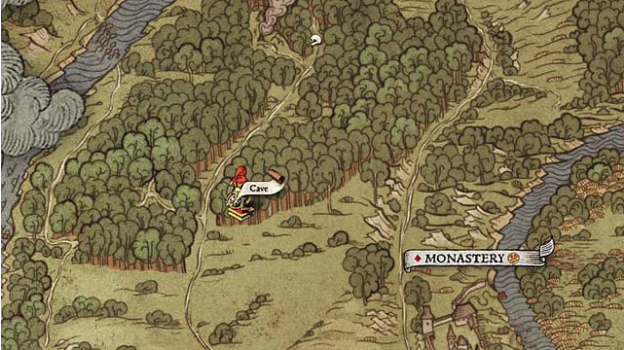 From Sasau, head straight to the Monastery, which is located to the north of Sasau, or south of Samopesh. In the western forest, you will find a cave, which will contain a chest with treasure from the first map.