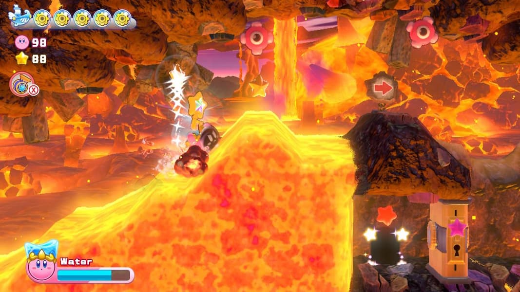 Moving on to the second sphere, you’ll need the water ability. Luckily there is a Galboros miniboss fight on the way. Steal its ability and move on. You’ll find a key on the way. Pick it up and dash over the lava because dashing as water Kirby creates water under you.