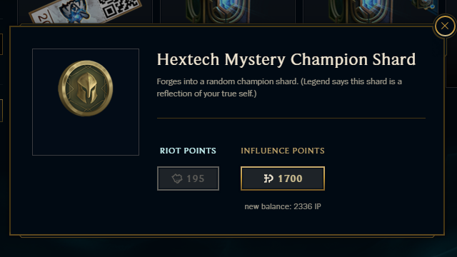 Hextech Mystery Champion Shards can be found in the Accessories tab of the Shop for 1700 IP. The annoying part is that you can’t buy multiple at a time, meaning that converting hundreds of thousands of IP could take some time.
