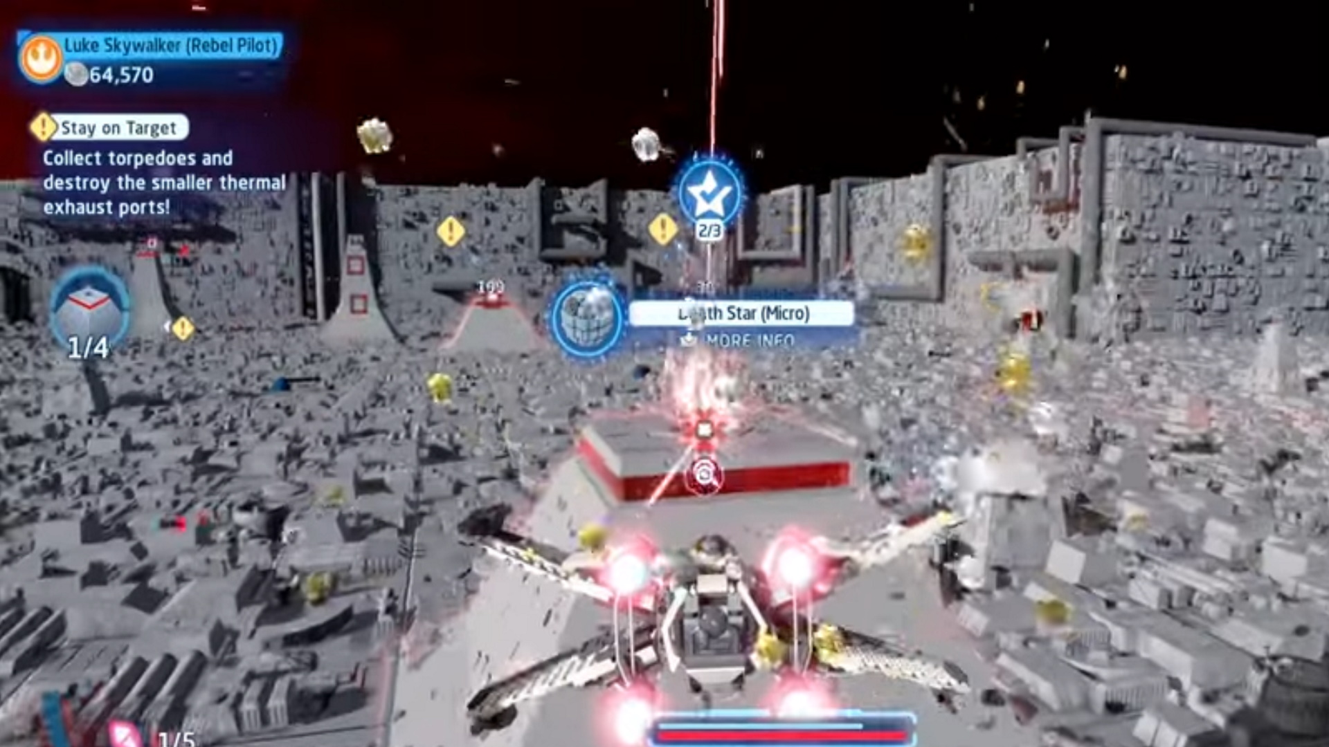 The first two stages have a number of objects and enemy fighters to destroy. A Skip and a Jump does as well, though it also has roughly two dozen large pipes you can destroy and get a cache of studs from, including blue studs.