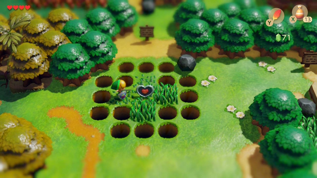 - The patch of bushes south of the previous Heart Piece holds another one. Exit the bay, and go counterclockwise around it, past the phone hut, and use the Pegasus Boots and Roc’s Feather combo to leap over the holes. Head downstairs, and dive in the deep water to find the Heart Piece.