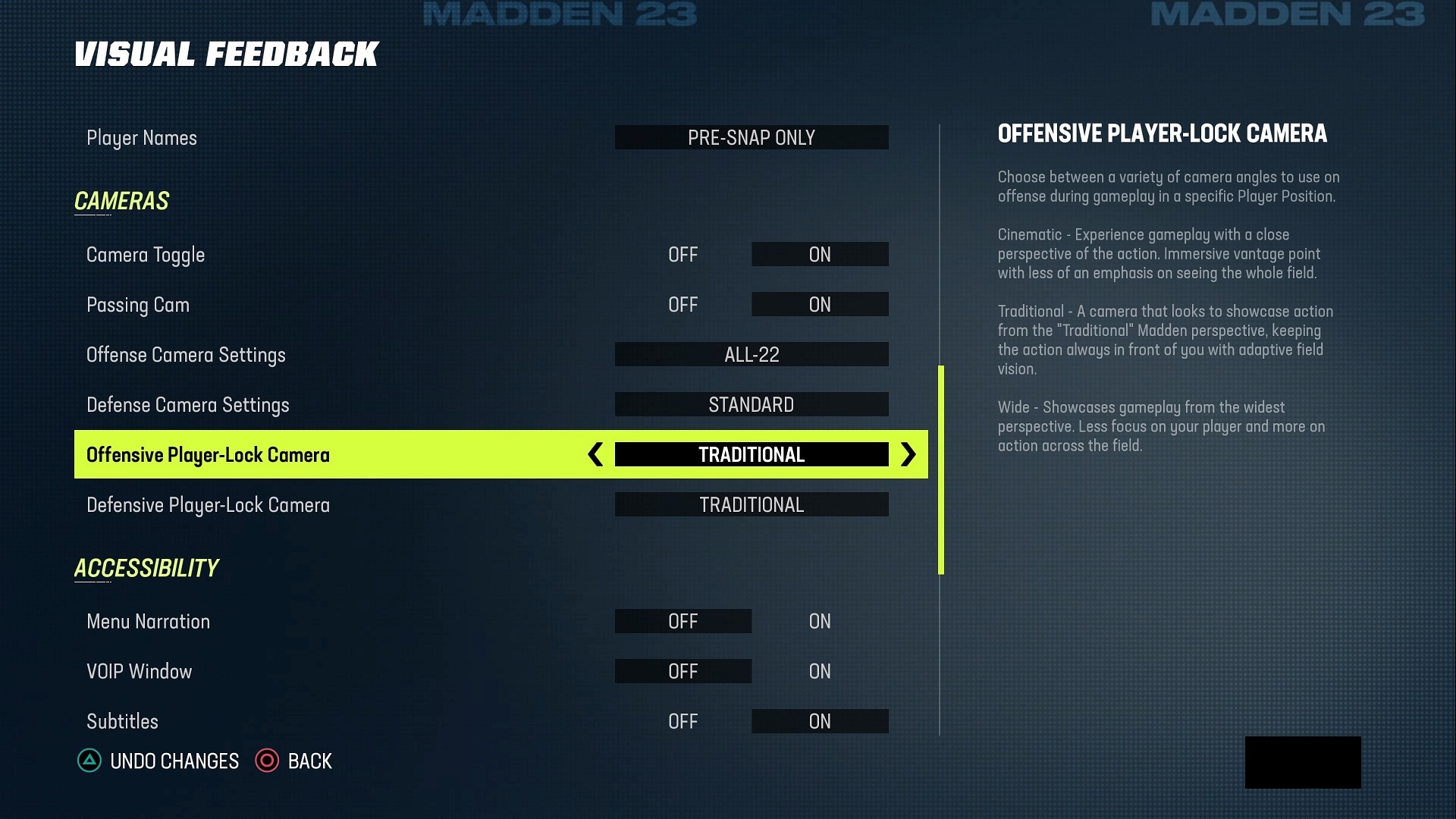 You can also tweak offensive and defensive player-lock options with Cinematic, Traditional, and Wide.