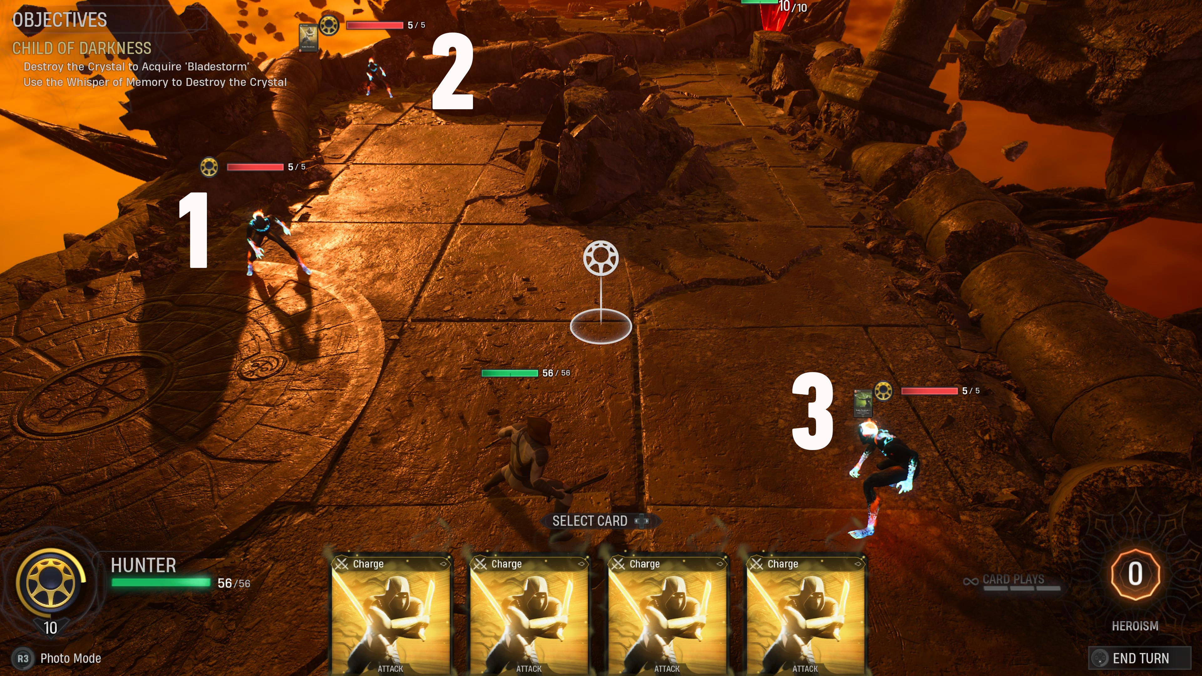 When you start up the challenge, you’ll be in a cosmic arena with three enemy grunts and a red crystal. To complete the challenge, you’ll need to destroy them all using the four cards in your hand and the two you gain from taking out the enemies. Use the image below to understand which enemy to be hitting at what time for the challenge.