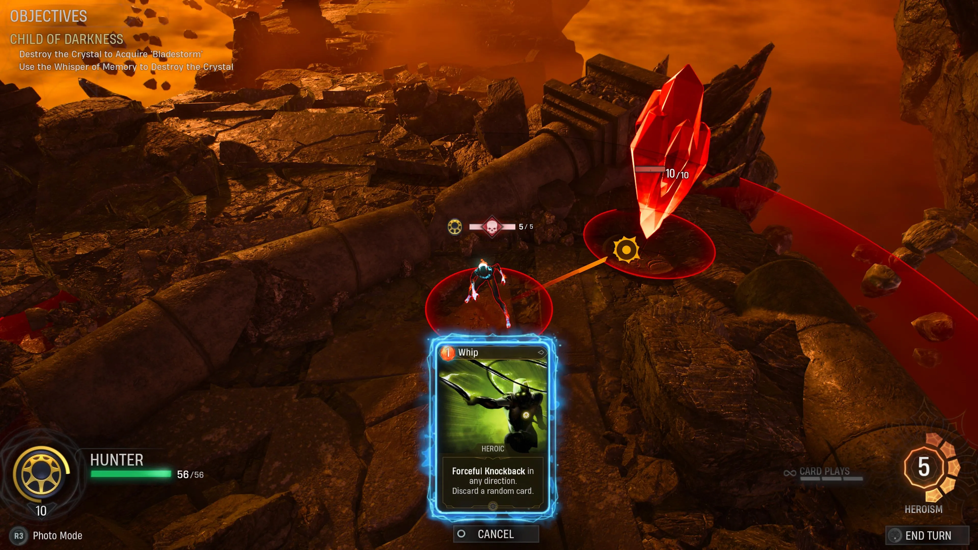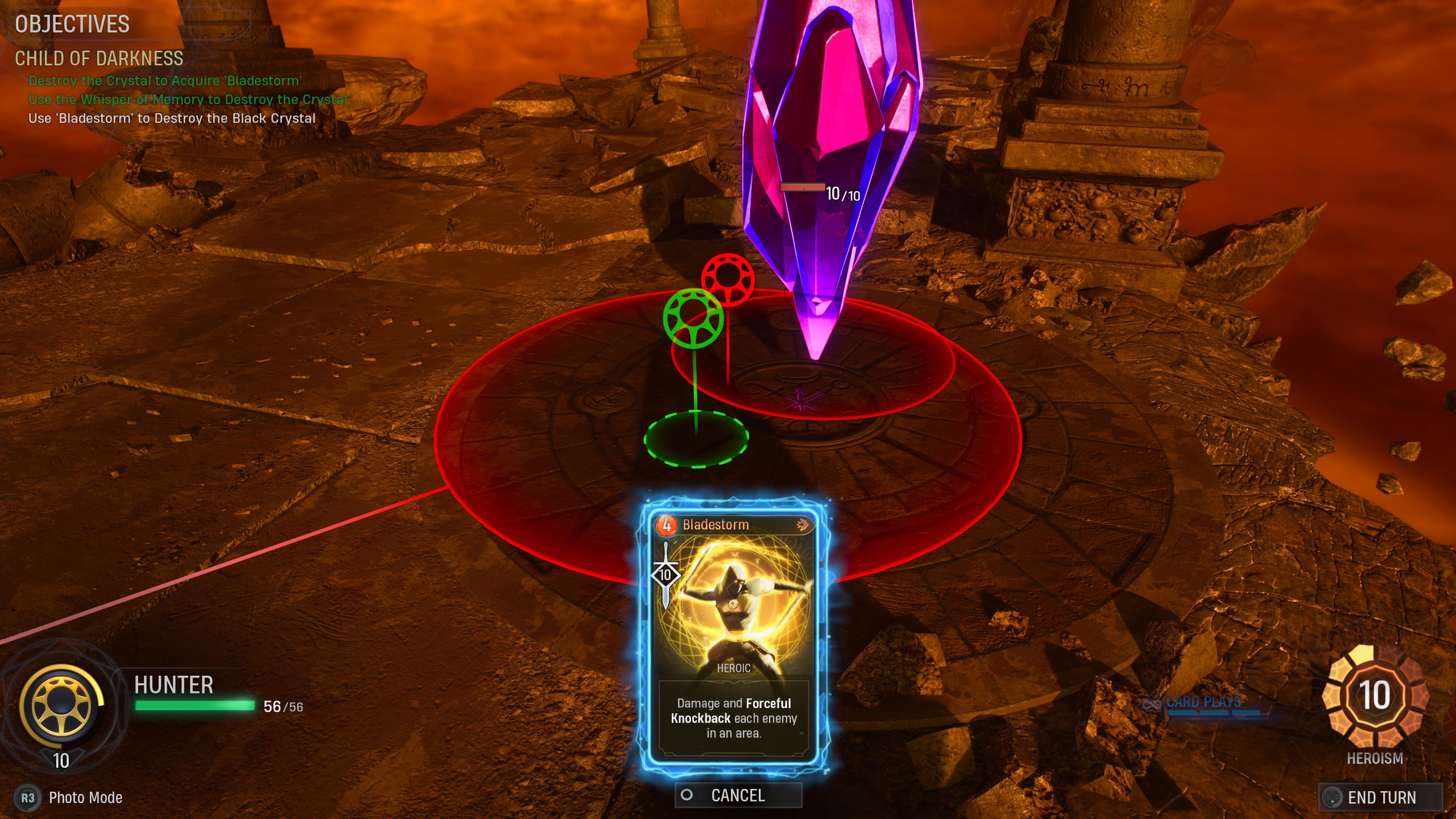 Now that the first crystal has been taken care of, you’ll pick up a “Bladestorm” card and a purple crystal will appear on the other side of the arena. Use “Bladestorm” on the purple crystal to destroy it and the challenge will be complete. You’ll be awarded the Hunter’s Midnight Sun Legendary Combat Suit, the “Bladestorm” card for your deck, and the Shadowstalker passive ability.