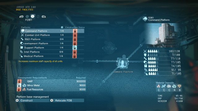FOBs work just like Mother Base. You can build platforms for each unit and expand them. The more platforms and decks you have, the more resources and GMP you’ll get. You’ll also make it harder for people to successfully invade your base, more on that later.