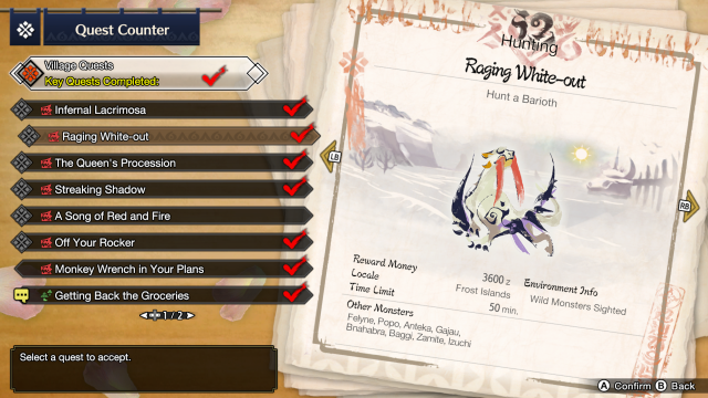 One Low Rank village quest and one hub quest have Barioth as the target monster. These quests are: