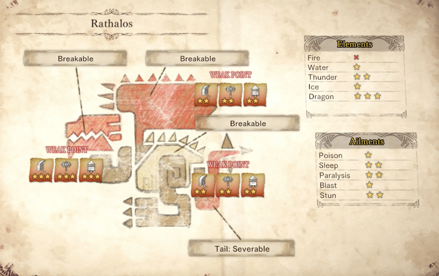 On the Monster Hunter: World star scale of 0 (immune) and 3 (most susceptible), these are the Rathalos strengths and weaknesses to keep in mind: