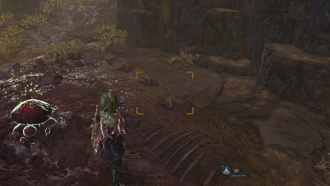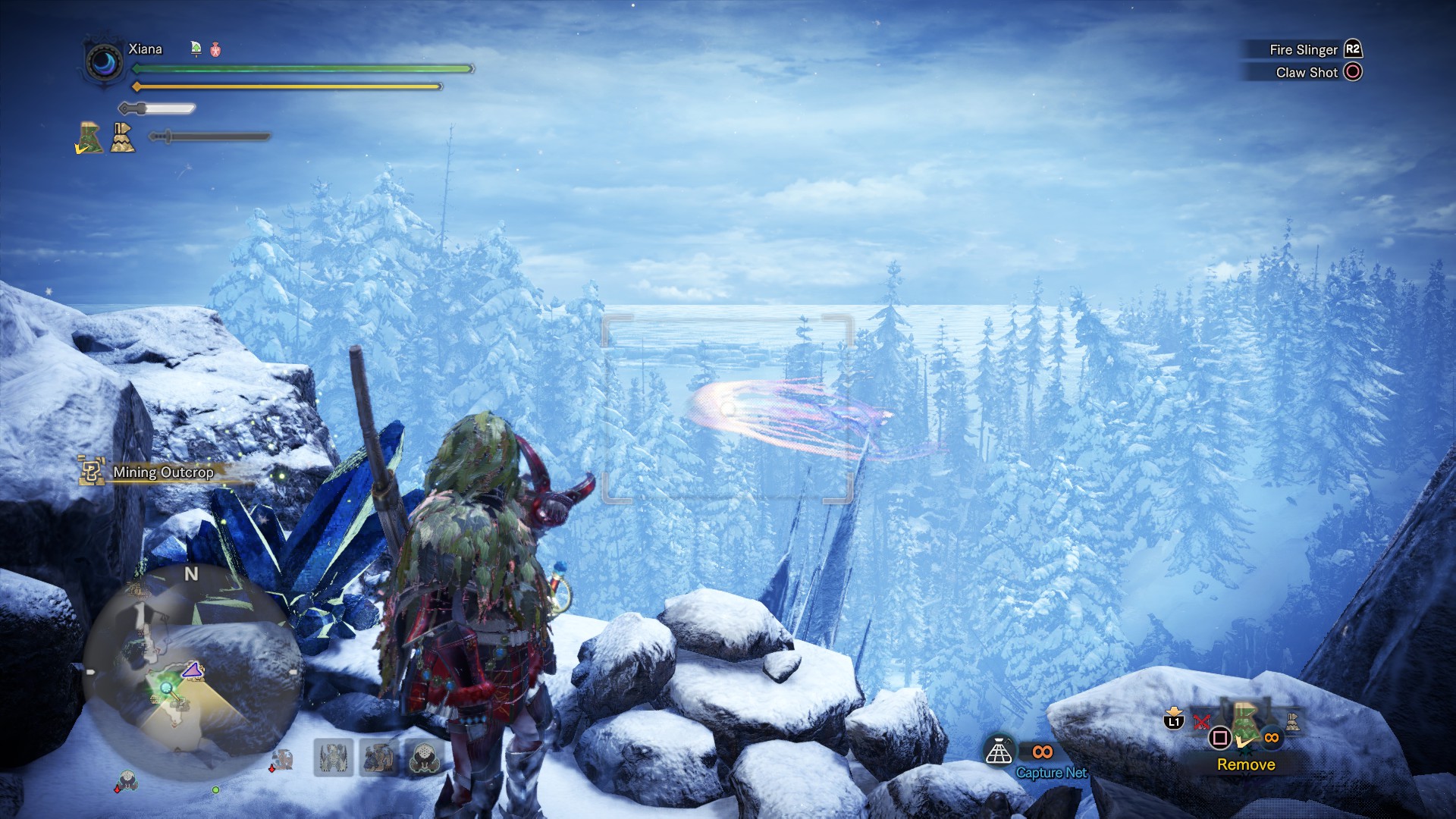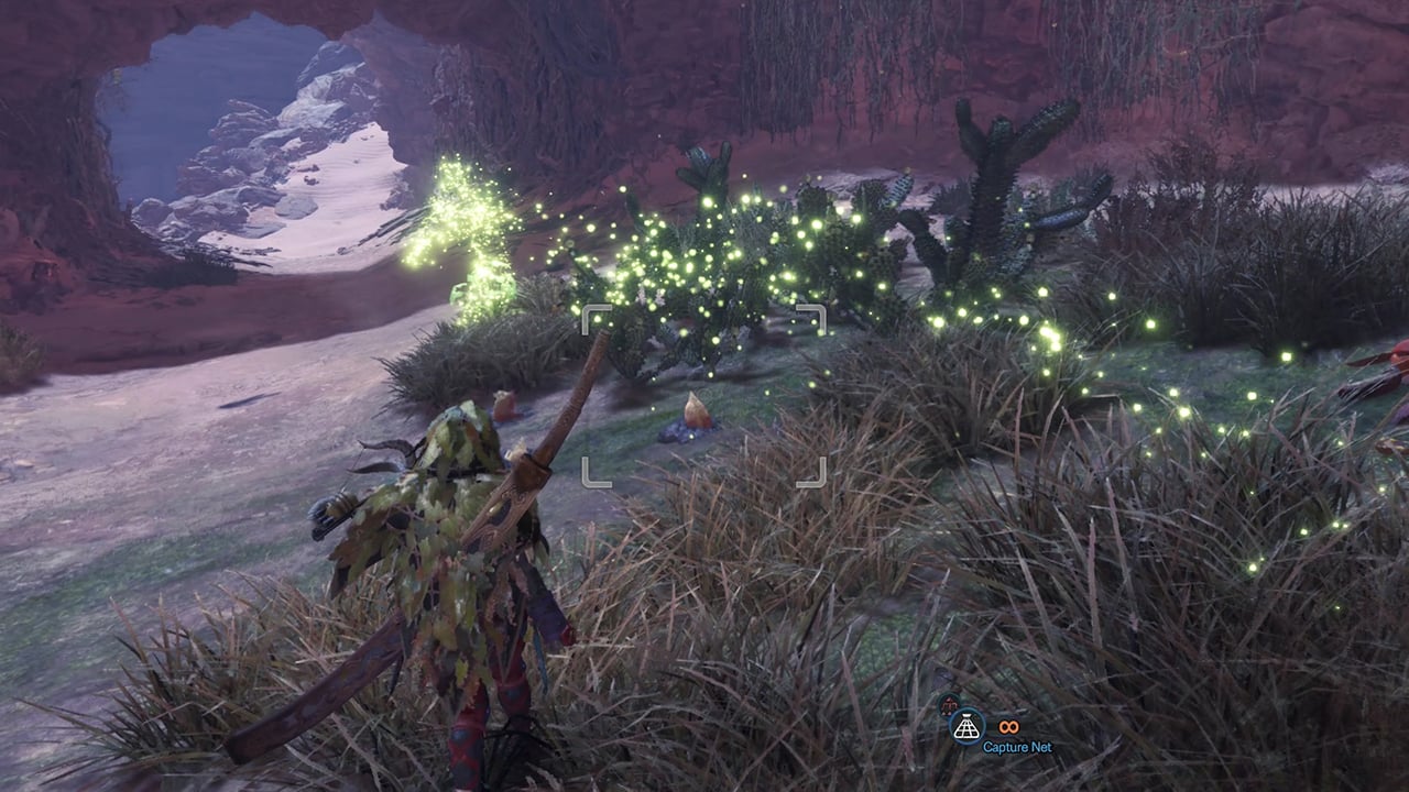 At the end of the path is a climbable ice wall. Don your Ghillie Mantle and head up. If you’re lucky enough to spawn the Wintermoon Nettle, it will be slowly floating about the summit and its three Mining Outcrops. Wait for it to come within range of your Capture Net (it won’t immediately run if you miss) and grab it.