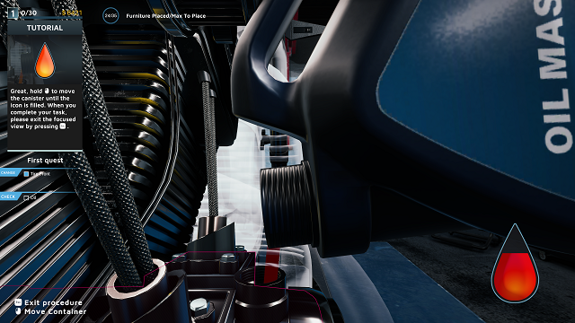 A container will appear. Continue to hold LMB to raise the container to a roughly 90-degree angle to begin pouring oil. On the right side of the screen, you’ll see a large oil droplet icon, and it will begin to fill with amber as you fill the engine.