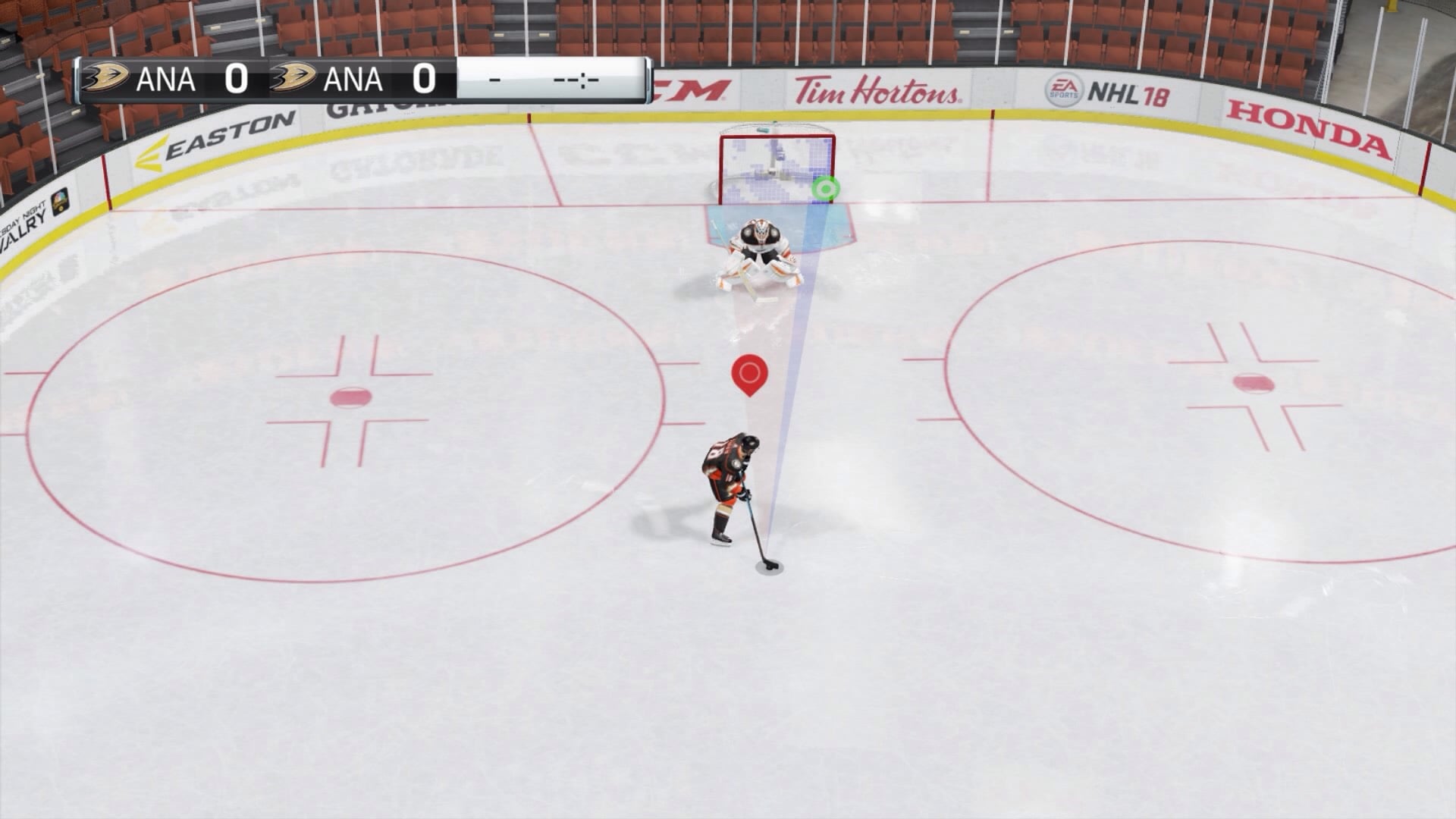 Aiming: When performing a slap shot or a wrist shot in NHL 18, you can use the left stick to aim the puck. The area covered in red is an area the goalie has covered, and the blue area is open. You will also see a target to show you generally where your puck will go. If it’s red, that means there’s practically no chance you’ll make it. If it’s blue, there’s a chance. If it’s green, that shot is clean and you’re most likely to make it.