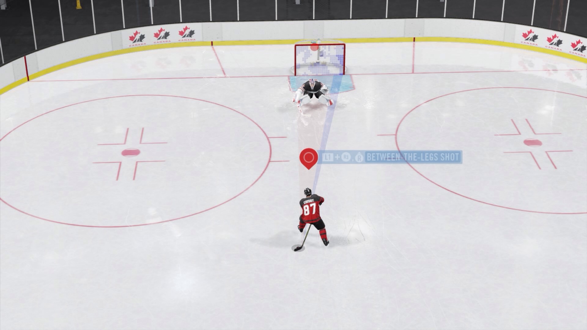 Backhand Drag Shot: This is another complicated deke. You first fake a shot then either perform a shot in another direction if the goalie isn’t expecting it — or if the goalie is wise to your tricks, flipping the puck up in the original direction of the fake shot to catch them off guard. To perform this, you fake the shot by pressing R3. Then you pull your puck away by pressing down on the right stick and shoot with up on the right stick. If you want to flip the puck up in the air, you tap R1 instead of pressing up.