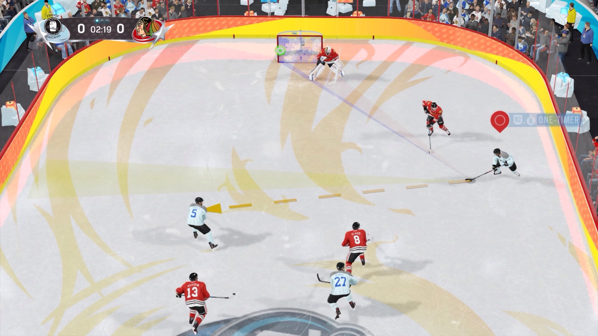 To perform a one-timer, pass your teammate the puck using R2 then hold up on the right stick to immediately shoot the puck upon getting control of it.
