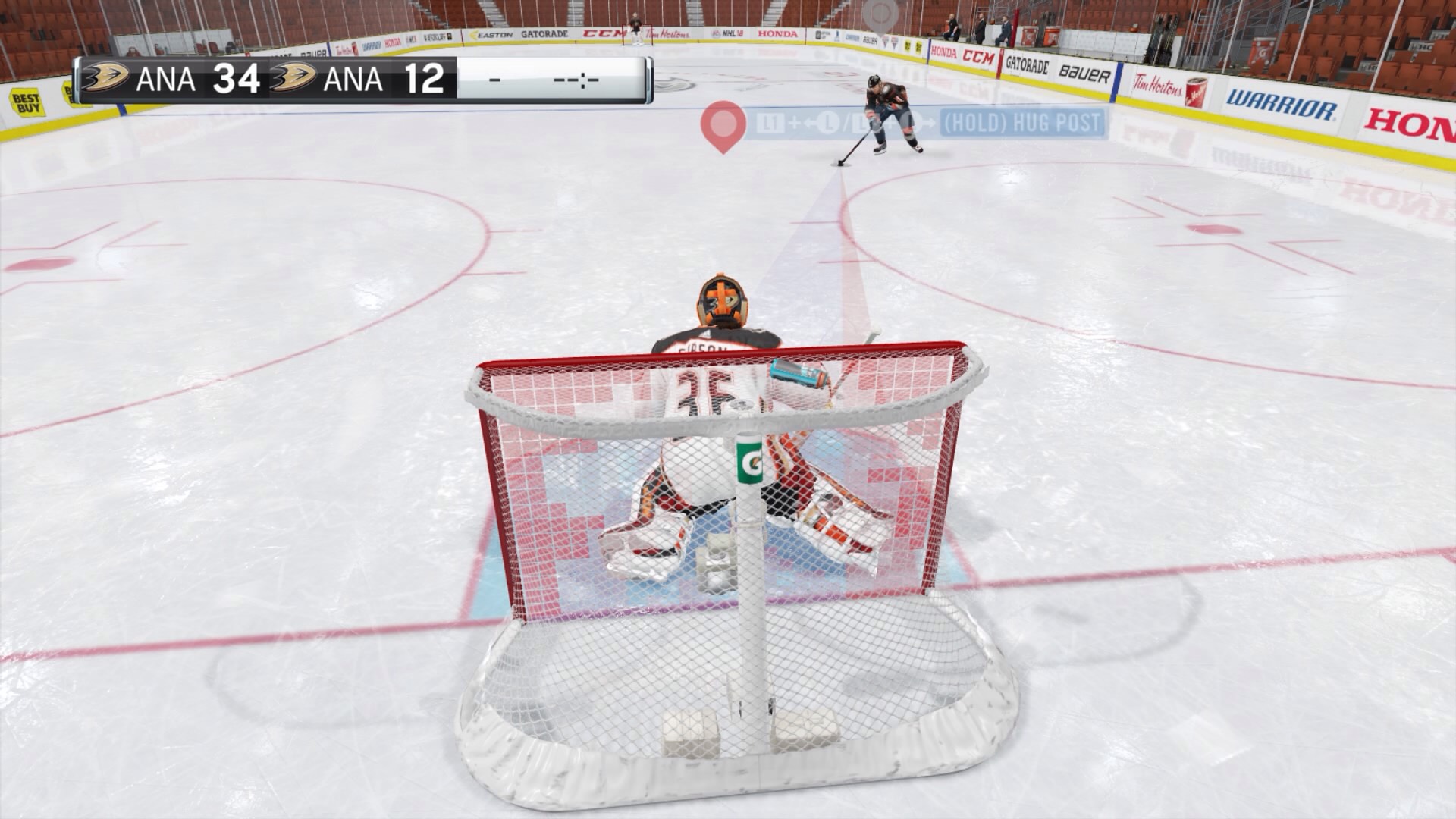 Hugging the Post: To hug the post (stay to one side of the net), you hold L1 and move the left stick to the side you want to hug. This is useful when playing NHL 18 if your opponent is coming around a corner to try and get a goal in. However, if your opponent is in the slot (the area directly in front of the goal), you want to avoid using this and instead stay in a more central, neutral position.