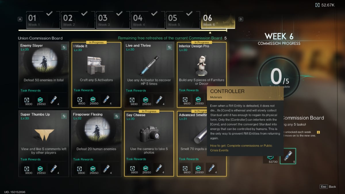 Weekly Commissions are tasks you must complete to earn rewards like experience points and the Controller item. For example, one challenge will task you with taking five photos with the camera, and another will have you craft 70 ingots. You’ll be able to complete five Commissions every week, each earning you Controller items. In addition, after the week is over, you’ll earn additional Controller items.