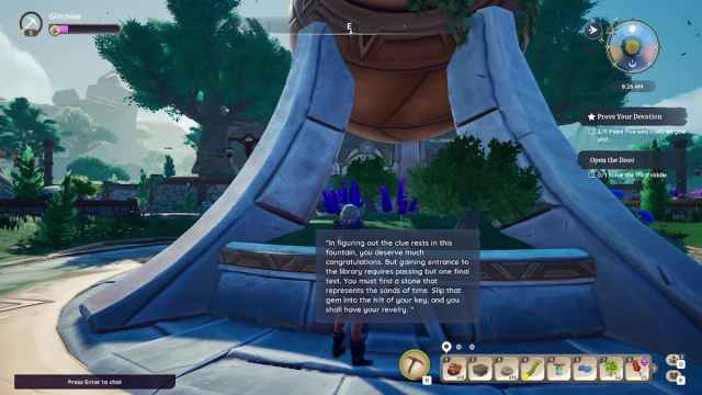 Unfortunately for those that don’t like riddles, the inscription that’s on the fountain points you to yet another task. It reads: In figuring out the clue rests in this fountain, you deserve much congratulations. But gaining entrance to the library requires passing but one final test. You must find a stone that represents the sands of time. Slip that gem into the hilt of your key, and you shall have your revelry.