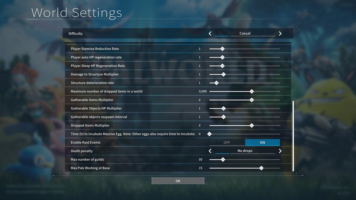 - Death Penalty: By far the most important setting in Palworld. This determines what you drop if you become incapacitated. The settings are: no drops (Casual), drop items only (Normal), and drop all items and Pals (Hard).