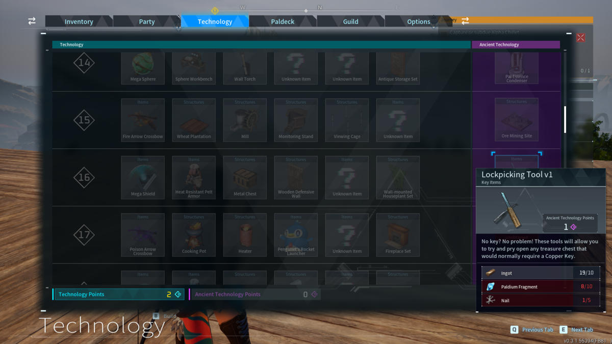 | Lockpicking Tool v1 | 16 | 10 x Ingot 10 x Paldium Fragment 5 x Nail |