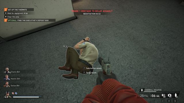 This isn’t always the most reliable way to tie up guards, though. They’ll still shoot at you during the initial Alarm phase, meaning you’ll need to ignore them. They might begin leaving the area right before the Negotiation phase begins, potentially leaving you with a small window to apprehend them. Additionally, they’ll surrender as soon as you look their way. At this point, they’re treated as civilians, meaning that shooting them will incur a penalty cost.