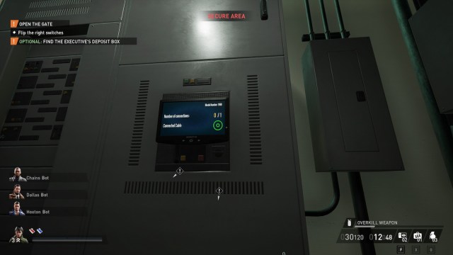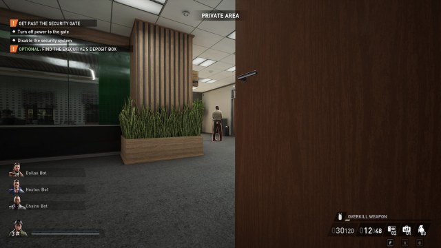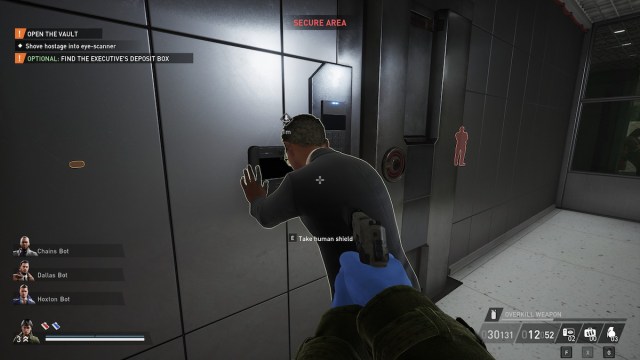 The vault door isn’t so easily opened — it requires a four-digit code and a Bank Executive. If you’re lucky, the bank manager you need will be alone in his office, which is next to the IT room. The next best option is that he’s on the second floor in the room next to the office. Simply use him as a human shield, drag him to the face scanner at the vault, and shove him into it to make it work. Consider tying up any civilians and incapacitating any guards that might see you beforehand.