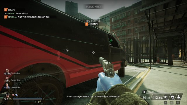 Your primary goal here is to lockpick the gate and steal the bags of money inside. These all have dye packs bundled in them, which are set to go off once the gate has been opened. You can save all the bags as long as you have at least two people, but with one, you can save six if you’re fast. Rush in when you’re ready and interact with the blinking lights on the bags to disarm the dye packs.