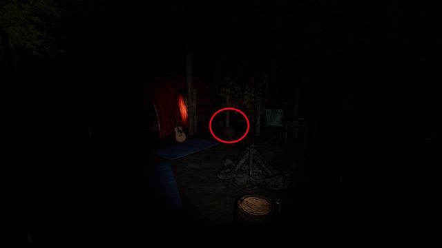 Time to go back through reception! Well, unless you’re already on that side of the map. From the map entrance, go straight through both reception offices to head into the main area of the campsite. Just walk straight until you come across an unlit campfire (though it may have just been out because it’s raining while I’m doing this).