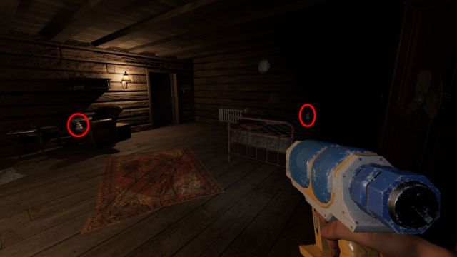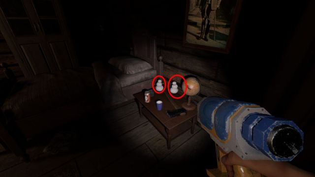 You’ll be able to find three snowmen in this room, two of which are hidden uniquely and most annoyingly. The two in the picture have to be shot after opening the cupboard, while the third is on the floor by the foot of the bed.