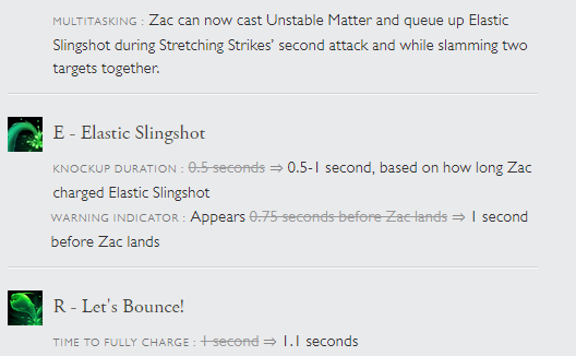 Zac’s E now has a longer knockup duration based on how long you charge the ability, going from 0.5 seconds uncharged to 1 second when fully charged. This is essentially a straight buff because in most cases, you would want to fully charge E before you use it. So Zac’s E knockup duration was basically doubled for free.