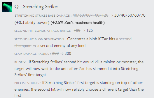 The image above shows Zac’s changes from Patch 7.10 and Patch 7.11 compiled into one list. Going through the changes one by one, let’s start with his Q buff.
