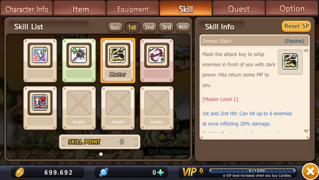 Skills in Pocket MapleStory are grouped into sets called Job Advancements. Skills can be “mastered” — with each skill requiring a different amount of skill points to master. You’ll start out wit 5 “Basic” skills. These are all already mastered (Master Level 1).