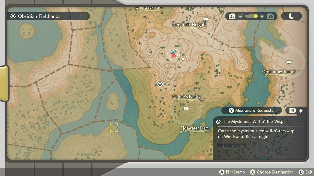 Track the quest after accepting it to make the next part easier, then fast travel to the Heights Camp in Obsidian Fieldlands. If it’s not night already, sleep in the bed there until night falls, as Chimchar won’t appear otherwise.