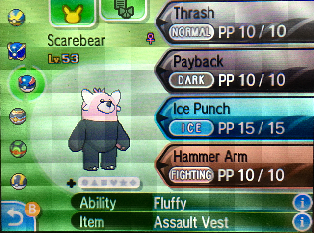 The moveset has multiple options, but I currently use: Thrash, Payback, Ice Punch, and Hammer Arm.