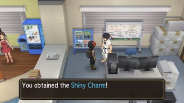 Just like the Shiny Charm, the Oval Charm can be obtained in Heahea City at the Game Freaks building. Go to the second floor of this building and head to the left of the room. Here, you’ll find Morimoto. Talk to him and you’ll jump into a battle against Morimoto and Iwao. You can only participate in this battle after you’ve beaten the Elite Four.